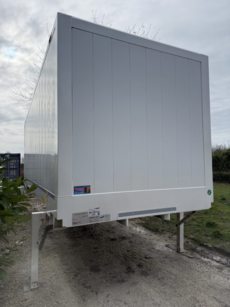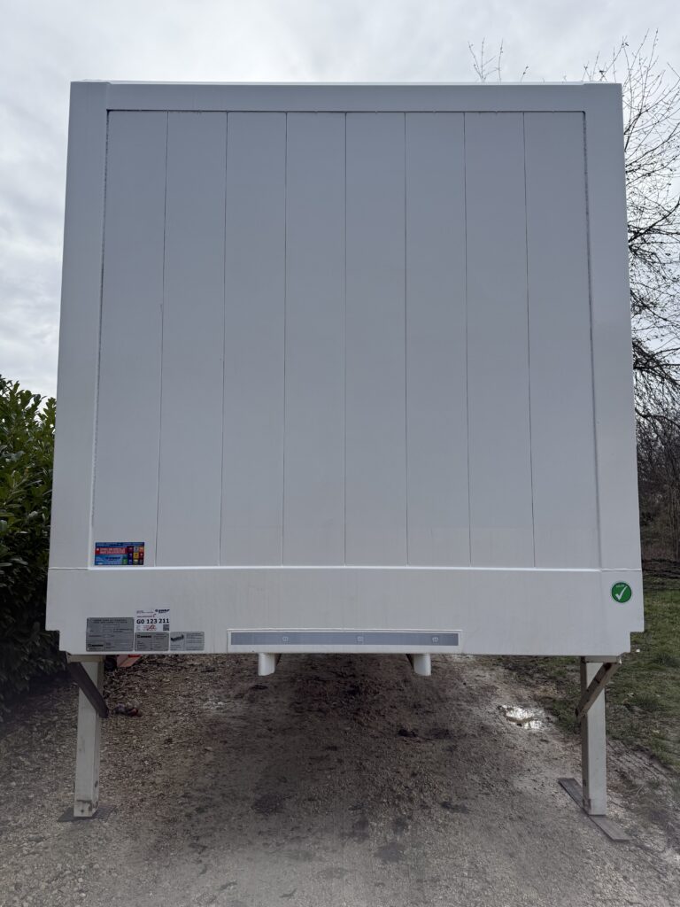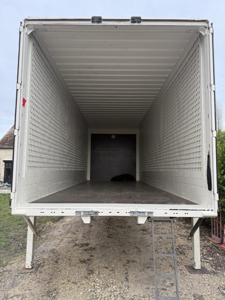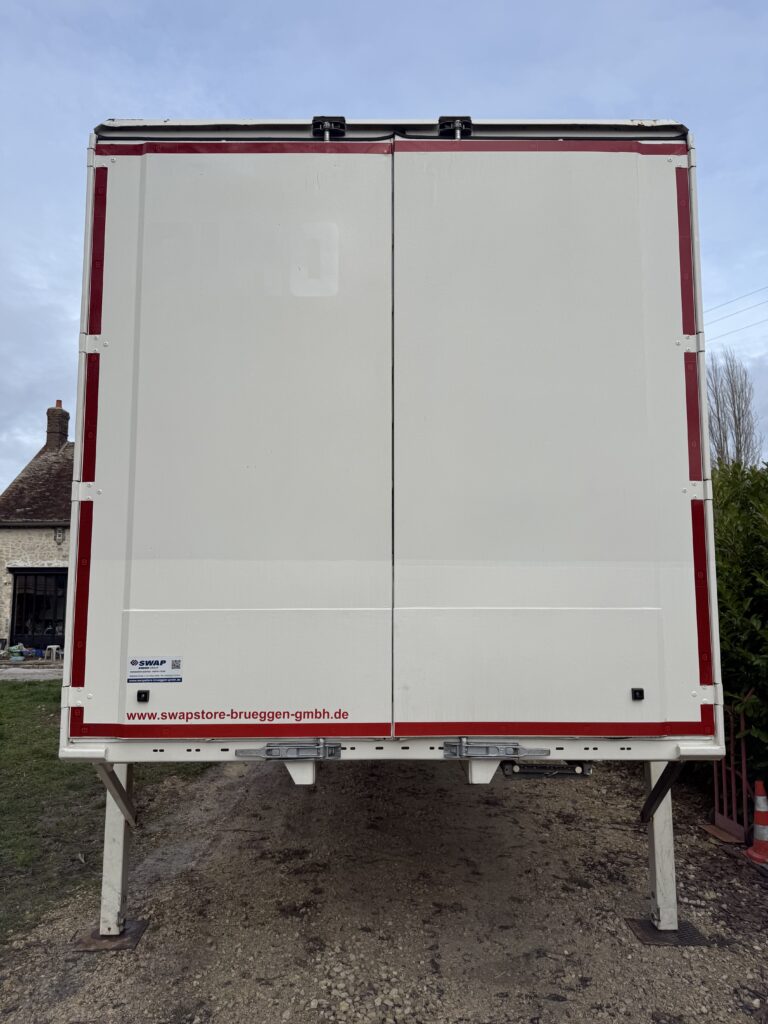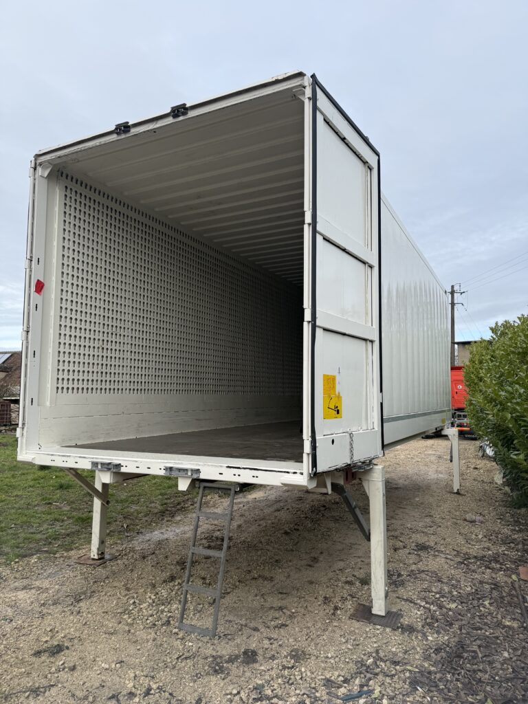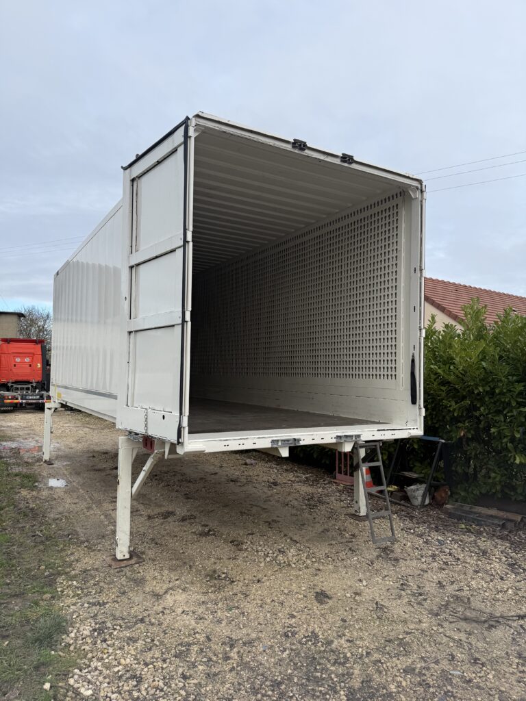 Bonjour, je vends une Caisse mobile avec twistlock et toit, transparent, fibre de verre d’origine et béquille en bon état réglable par goupilles, trois rails pour barre aluminium ou sangles à Clips Porte en bon état, ferme correctement Caisse mobile en état de fonctionnement. D’une (hauteur de 2,60m)-(largeur 2,50m)-(longueur 7,30m). (Dimension avant de l’aplomb au twistlock avant 65cm)-(Dimension arrière de l’aplomb au twistlock arrière 85cm)